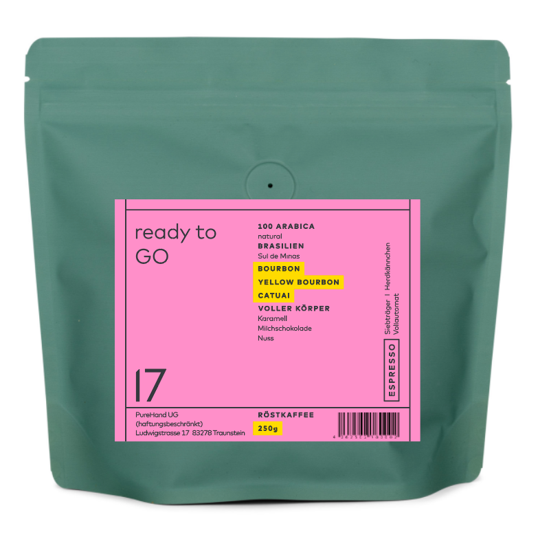 Der ready to GO Espresso ist ein ausgewogener Blend aus einer Fülle natürlich aufbereiteter Varietäten aus der hügeligen Region im brasilianischen Sul de Minas. Der ready to GO hat einen vollen cremigen Körper, süße, dunkle Schokolade und Beeren machen ihn zu einem angenehmen Espresso und einem ausgewogenen Cappuccino.