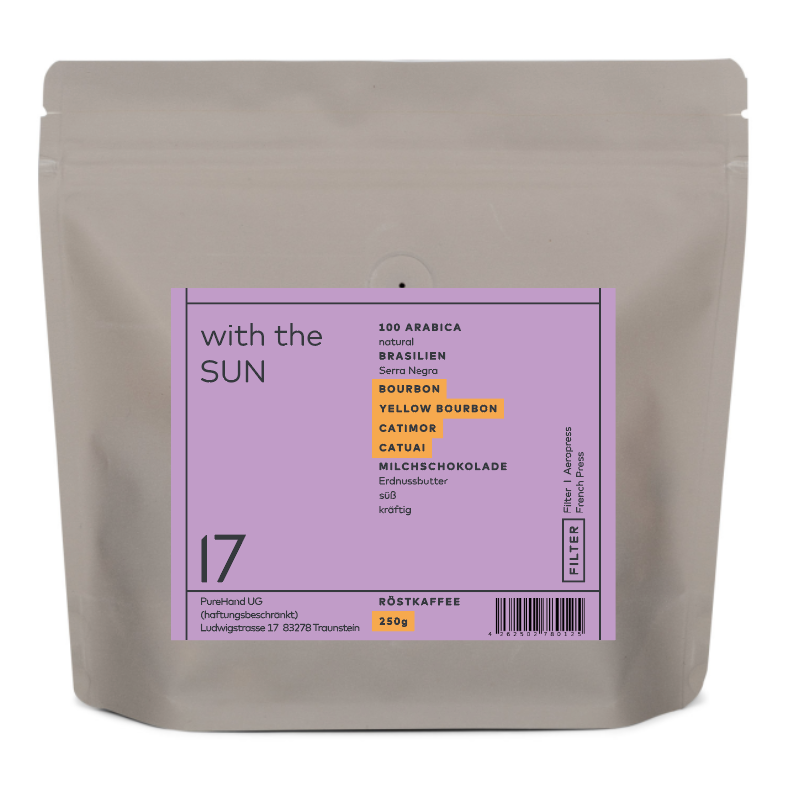 Unser Tag startet with the SUN. Er ist ein harmonischer Filterkaffee aus einer Fülle natürlich aufbereiteter Varietäten aus der hügeligen Region im brasilianischen South Minas. Der with the SUN hat einen ausgewogenen und säurearmen Körper. Milchschokolade und Erdnussbutter machen ihn zu einem angenehmen Filterkaffee auch in Verbindung mit Milch.
